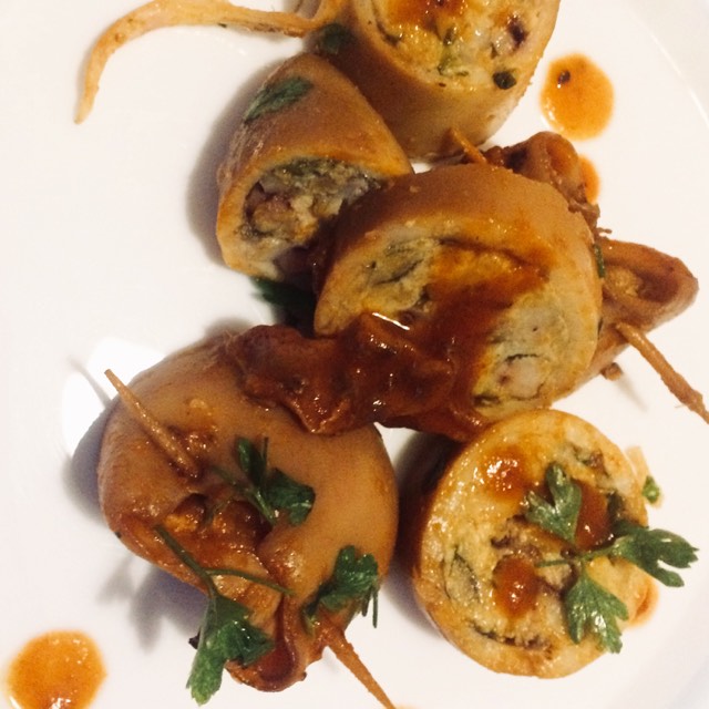 Pulire i calamari e friggere in olio d’oliva i tentacoli tagliati a pezzetti. Battere le uova aggiungendo il parmigiano, pinoli, sale prezzemolo, i tentacoli fritti precedentemente e la mollica di pane sbriciolata.